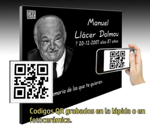 Código QR, mediante este encriptado de datos podemos acceder por medio de un terminal móvil smartphone o tablet y que tengan conexión a internet para poder enlazar a imágenes, archivos, videos de nuestro ser querido, que previamente habremos alojado en una web o servidor para que cualquier familiar, amigo o conocido mantenga siempre el recuerdo latente más allá de la lápida física.